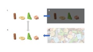 • ให้นักเรียนลองใช้มือสัมผัสภายในถุง โดยไม่มองเห็น และค้นหาชิ้นส่วนที่คิดว่าเหมือนกับต้นแบบ