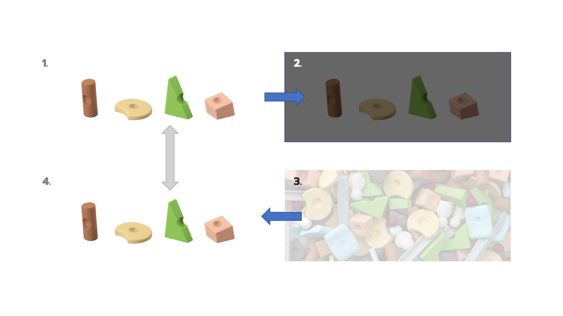หยิบชิ้นส่วน Resources® ออกมาสัก 5-10 ชิ้น แล้วจัดเรียงในลักษณะที่แตกต่างกัน (เช่น แนวเรียงตามสี ขนาด หรือรูปทรง) เพื่อให้ผู้เรียนได้เริ่มฝึกสังเกต